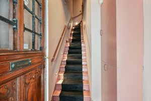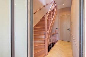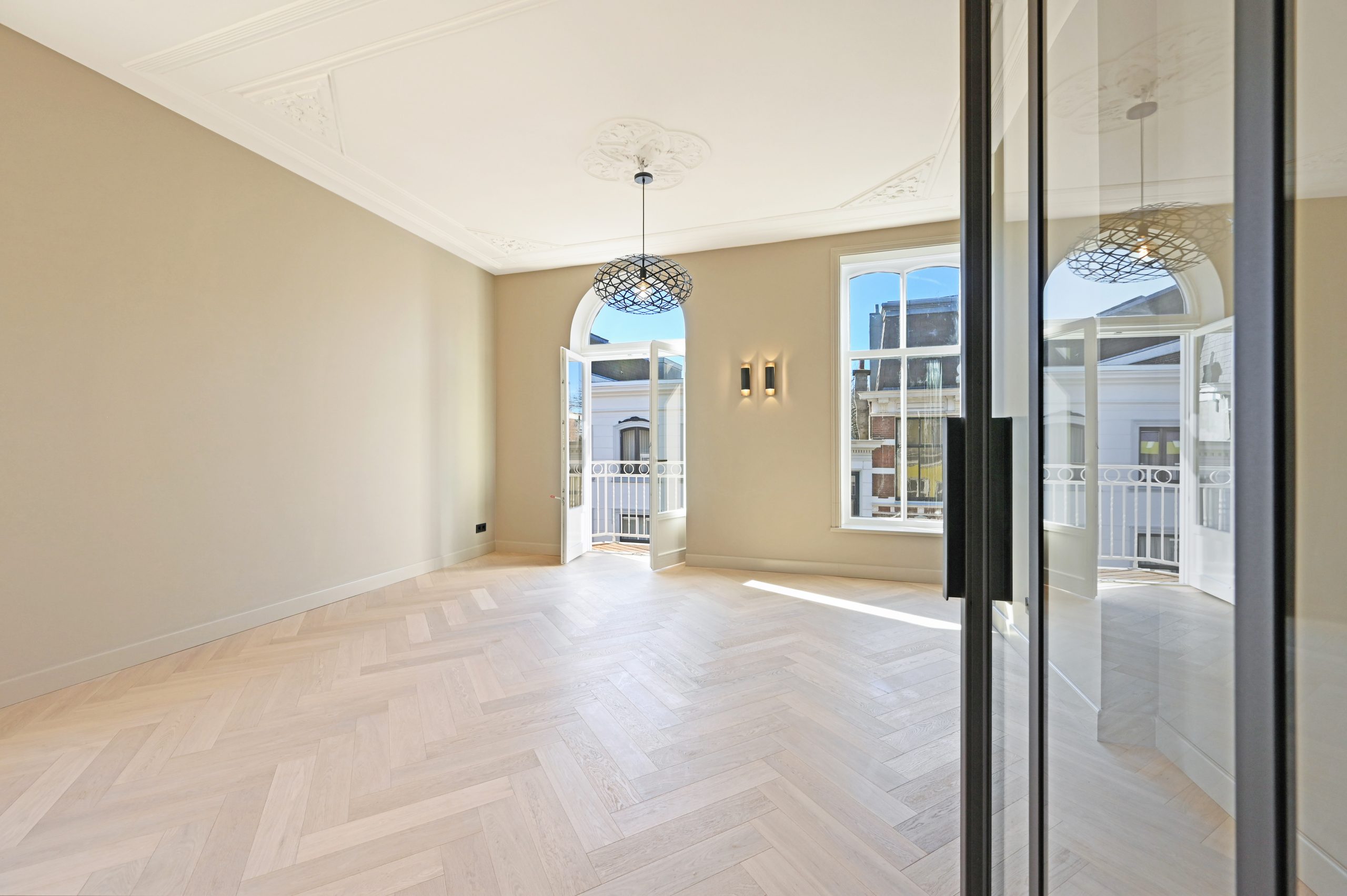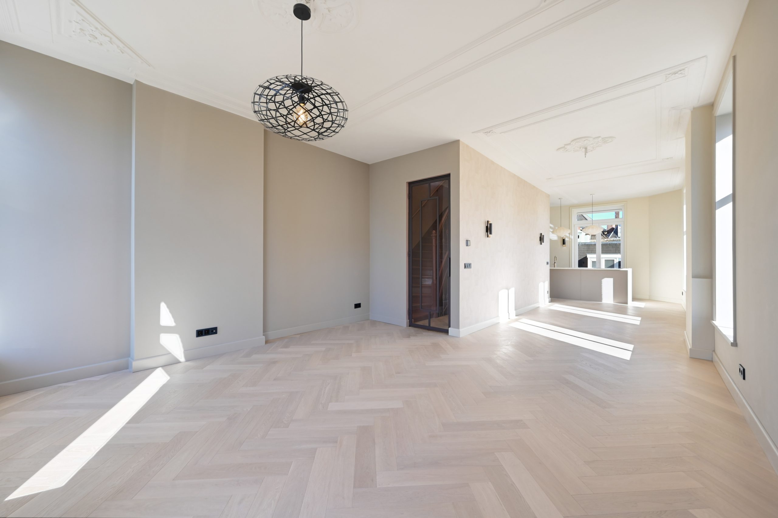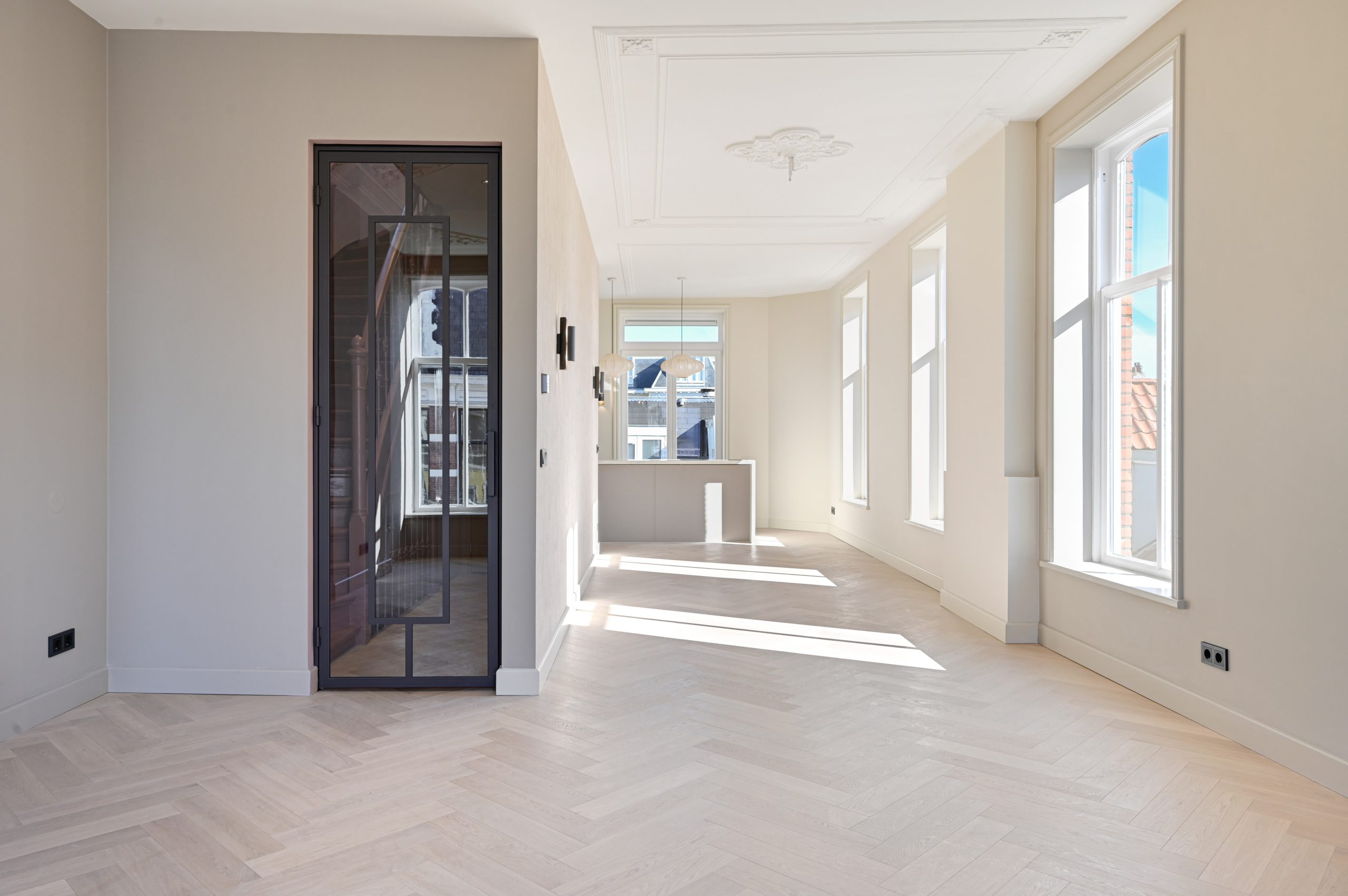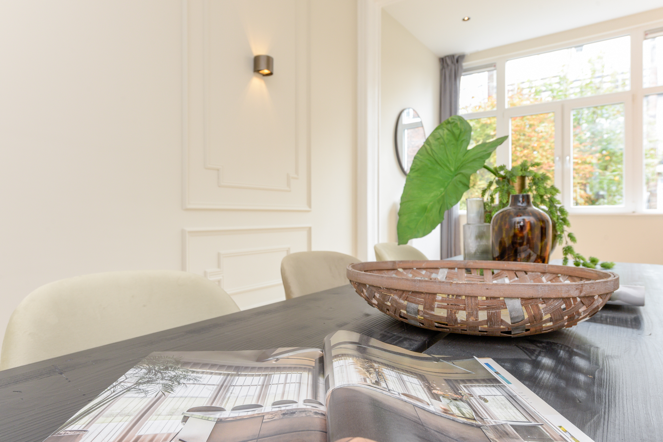 Originele details zoals hoge ornamentenplafonds en grote houten kozijnen geven de woning een karakteristieke sfeer en laten veel daglicht binnen.