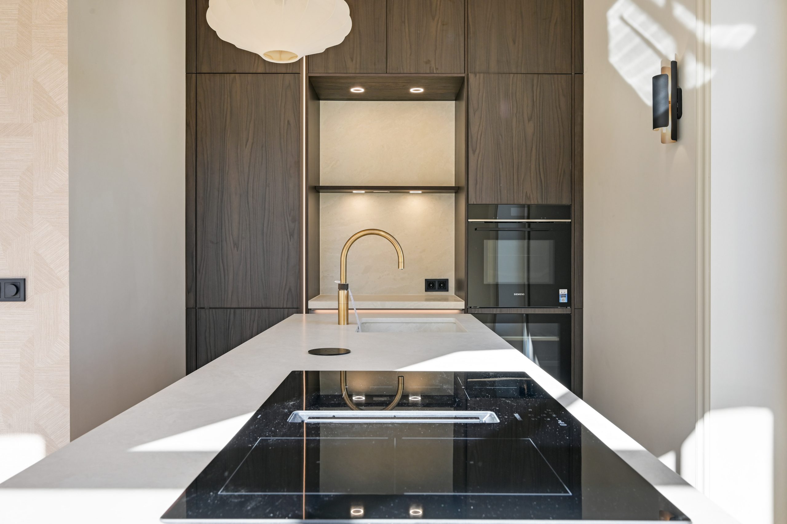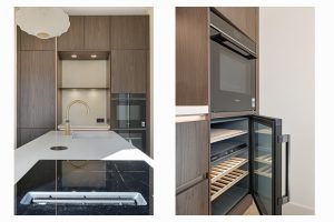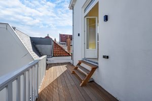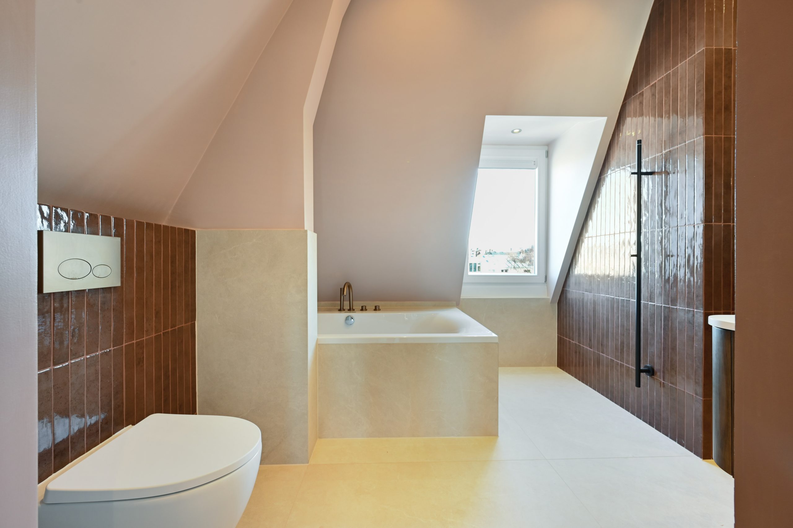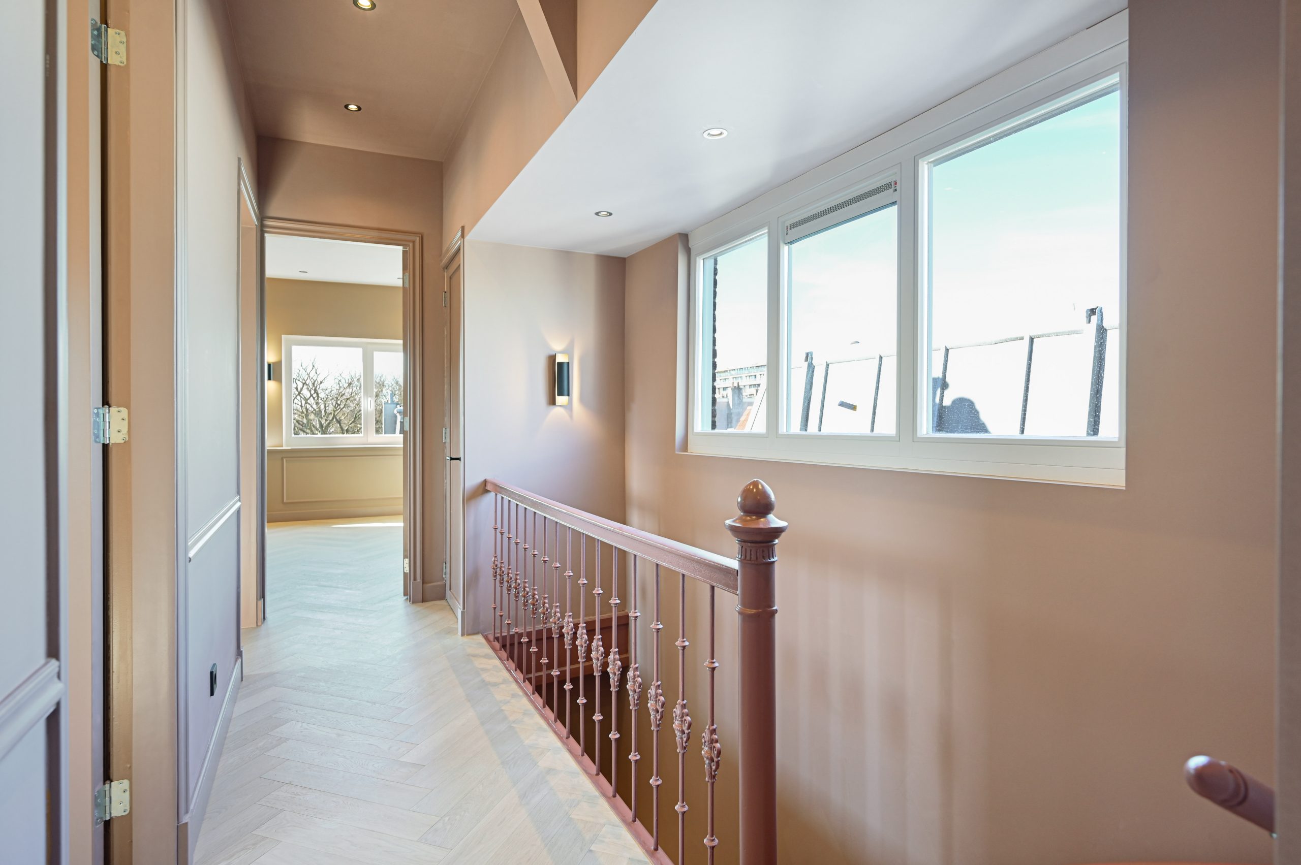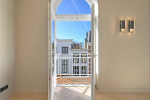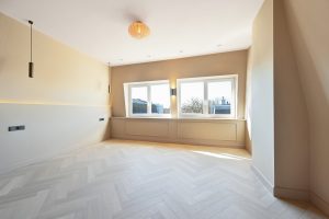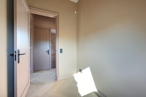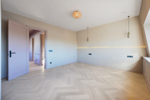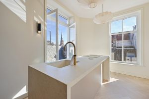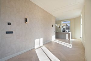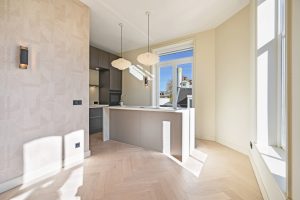De woning beschikt over drie goede slaapkamers, een lichte woon-eetkamer, en een moderne keuken met kookeiland. De ruime badkamer is uitgerust met een ligbad, regendouche, inbouwkranen, een tweede toilet en vloerverwarming. Door het hele appartement ligt een stijlvolle houten visgraatvloer, gecombineerd met ingebouwde spots en wandverlichting voor een warme, luxe uitstraling.